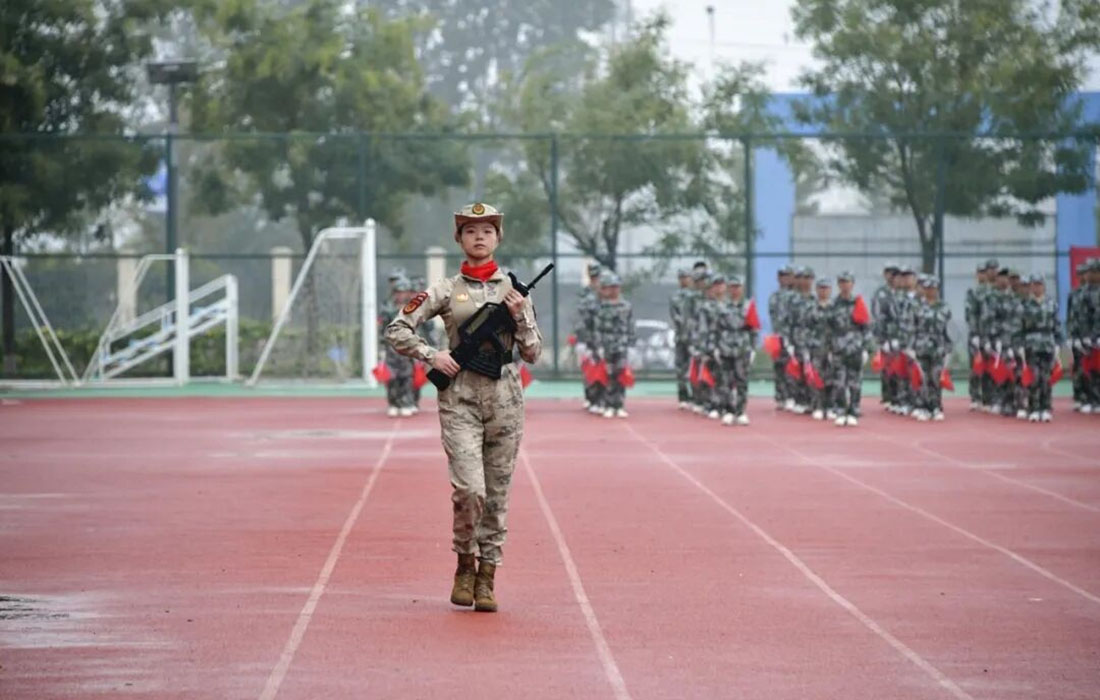 新生军训团列队完毕,李明珍听取新生军训团指挥长报告后,当即下令:“开始!”